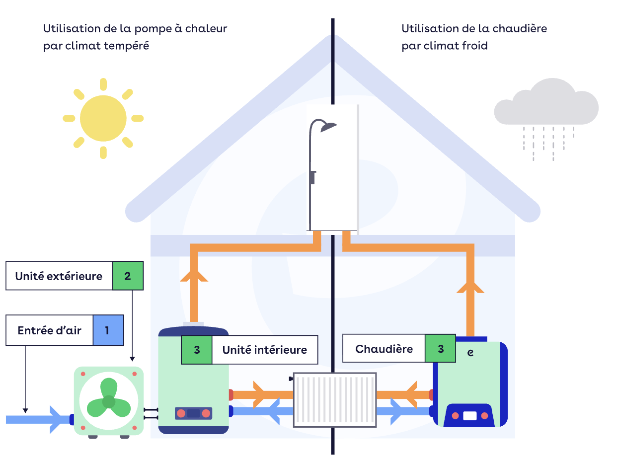 Dans ces configurations, environ 50 % de la puissance est assurée par une pompe à chaleur, qui utilise les calories de l'air pour produire de la chaleur avec une faible consommation électrique. Les 50 % restants sont assurés par un système d'appoint, pouvant fonctionner au gaz ou aux granulés de bois, afin de répondre aux besoins lors des périodes de forte demande.