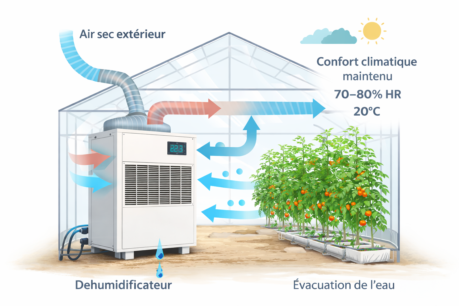 La combinaison d'une déshumidification contrôlée et d'un renouvellement d'air adapté permet de conserver une zone de confort climatique, généralement située autour de 70 à 80 % d'humidité relative à 20 °C (valeur indicative à ajuster selon les cultures). Cette approche réduit considérablement les risques sanitaires et contribue à optimiser la productivité et la qualité des récoltes .